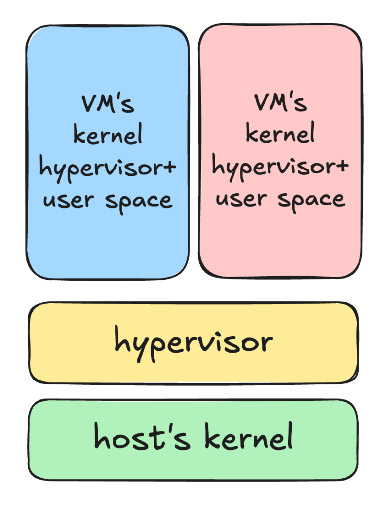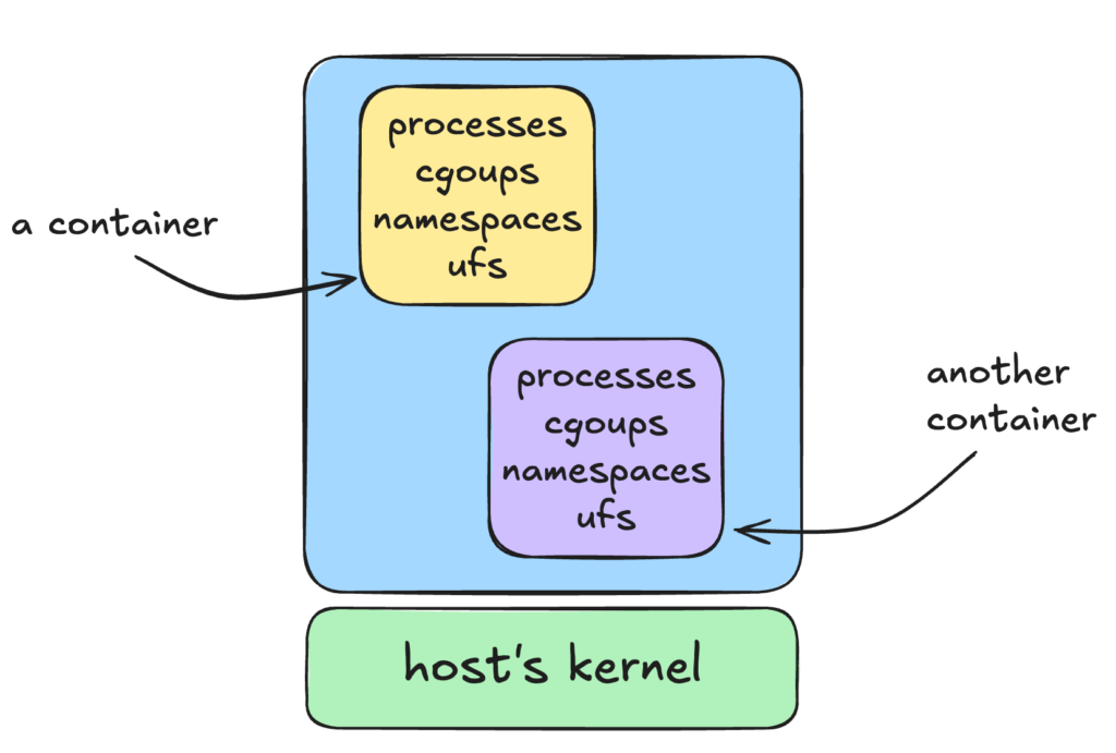 Unlike real VMs that have their own kernel and user space, containers use the host’s kernel as processes which are isolated and this is achieved by core linux features like namespaces, cgroups and some more.